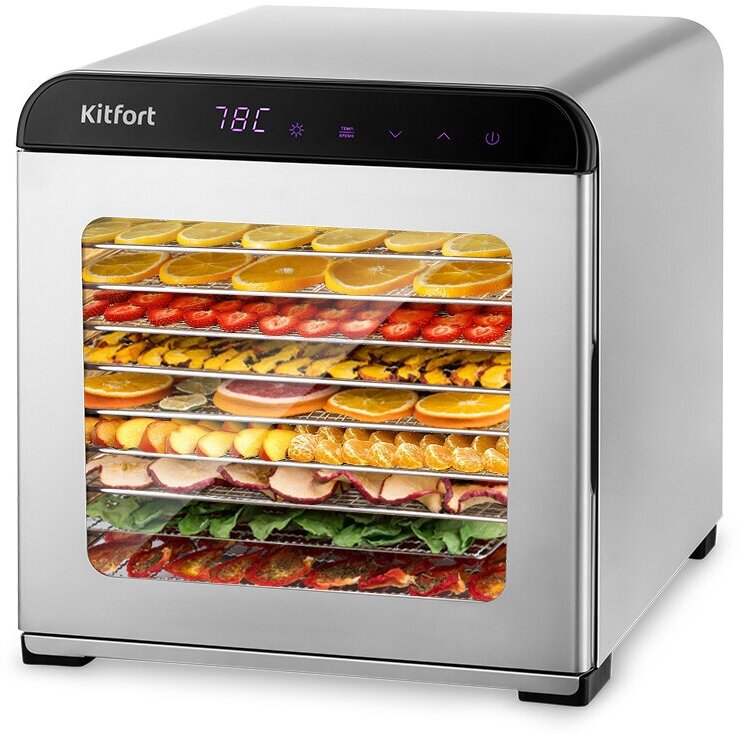 Вместительная сушилка для овощей и фруктов КТ-1947 сохранит любимые фрукты и овощи полезными круглый год Прибор насушит на всю зиму помидоры, кабачки, баклажаны, клубнику, абрикосы, мясо, рыбу, персики, тыкву, грибы, зелень, а также хлеб.