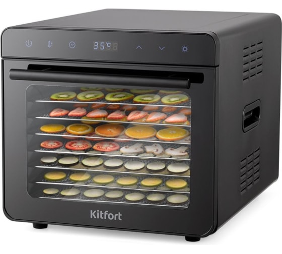 Сушилка для овощей и фруктов KITFORT КТ-1949 сохранит любимые фрукты и овощи полезными круглый год! Она насушит на всю зиму мясо, рыбу, помидоры, клубнику, персики, грибы, зелень, хлеб.