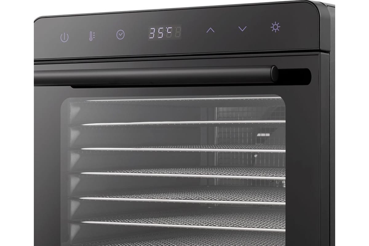 Через стекло в дверце и благодаря дополнительной подсветке можно следить за процессом сушки любимых фруктов.