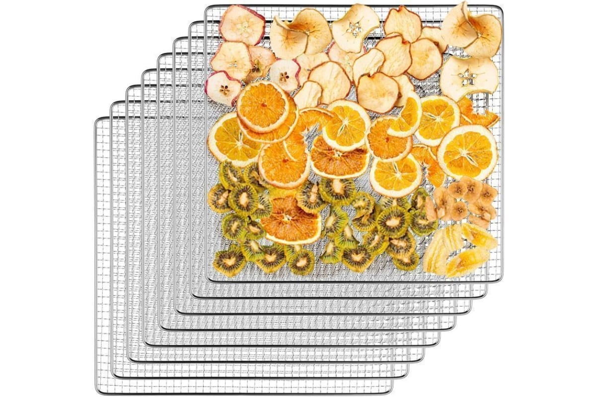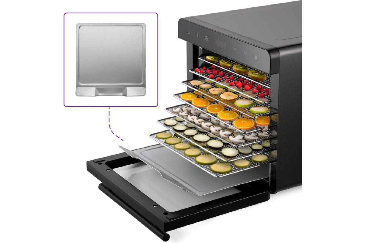 В комплекте к сушилке идут 8 металлических поддонов. Они подходят для большинства типов продуктов. Продукты разного типа рекомендуется выкладывать на разные поддоны.