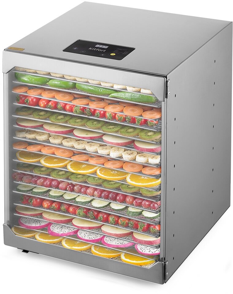 Вместительная сушилка для овощей и фруктов КТ-1956 сохранит любимые фрукты и овощи полезными круглый год! Прибор насушит на всю зиму помидоры, кабачки, баклажаны, клубнику, абрикосы, мясо, рыбу, персики, тыкву, грибы, зелень, а также хлеб.