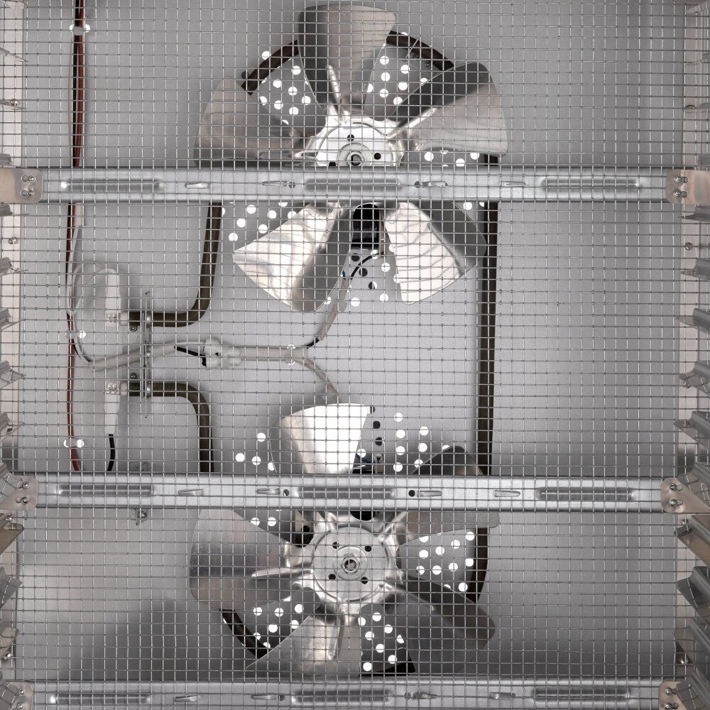 В сушилке установлен мощный нагревательный элемент и 2 вентилятора большого диаметра, обеспечивающие равномерное распределение нагретого воздуха по всему объёму камеры. Благодаря горизонтальному обдуву смешение запахов разных продуктов минимально.