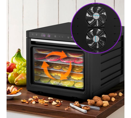 В сушилке установлено два мощных нагревательных элемента и два вентилятора с лопастями большого диаметра, обеспечивающие равномерное распределение нагретого воздуха по всему объему камеры. Благодаря горизонтальному обдуву смешение запахов при сушке одновременно разных продуктов минимально.