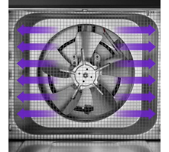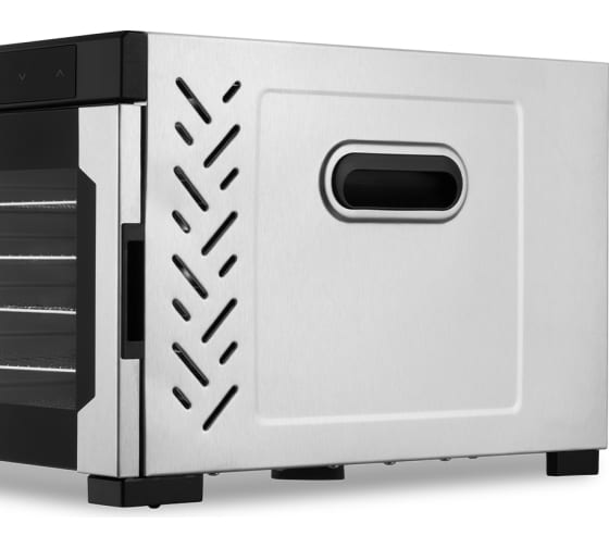 В сушилке установлен мощный нагревательный элемент и вентилятор с лопастями большого диаметра, обеспечивающий равномерное распределение нагретого воздуха по всему объему камеры. Благодаря горизонтальному обдуву смешение запахов при сушке одновременно разных продуктов минимально.