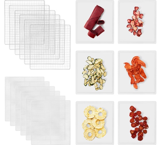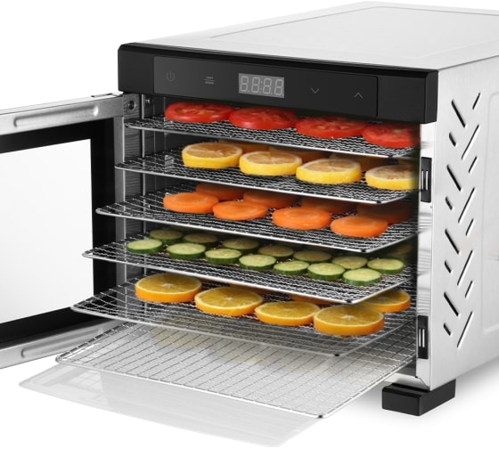 В комплекте к сушилке идут 6 металлических поддонов, 6 сеток для мелких продуктов и 6 сплошных пластиковых поддонов.