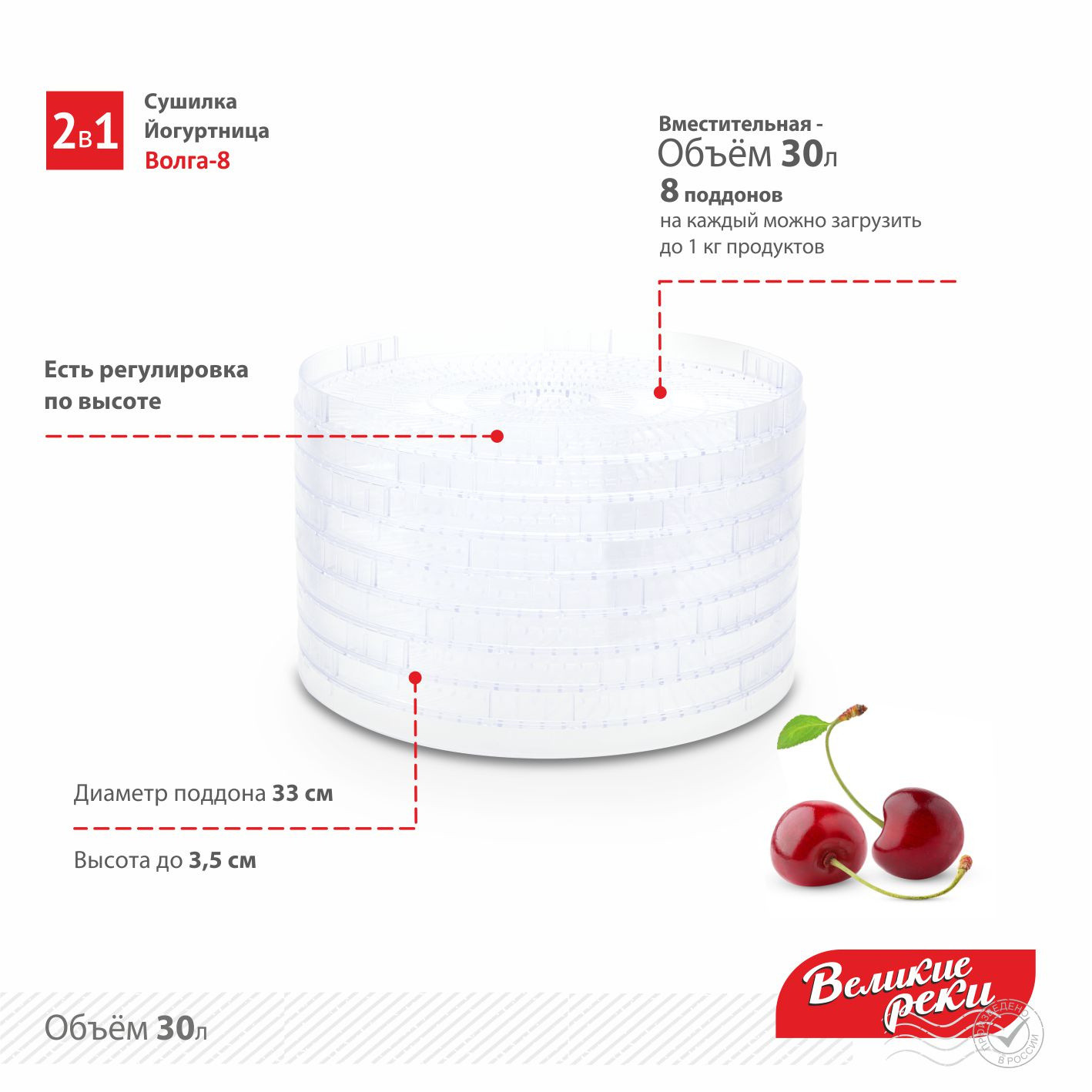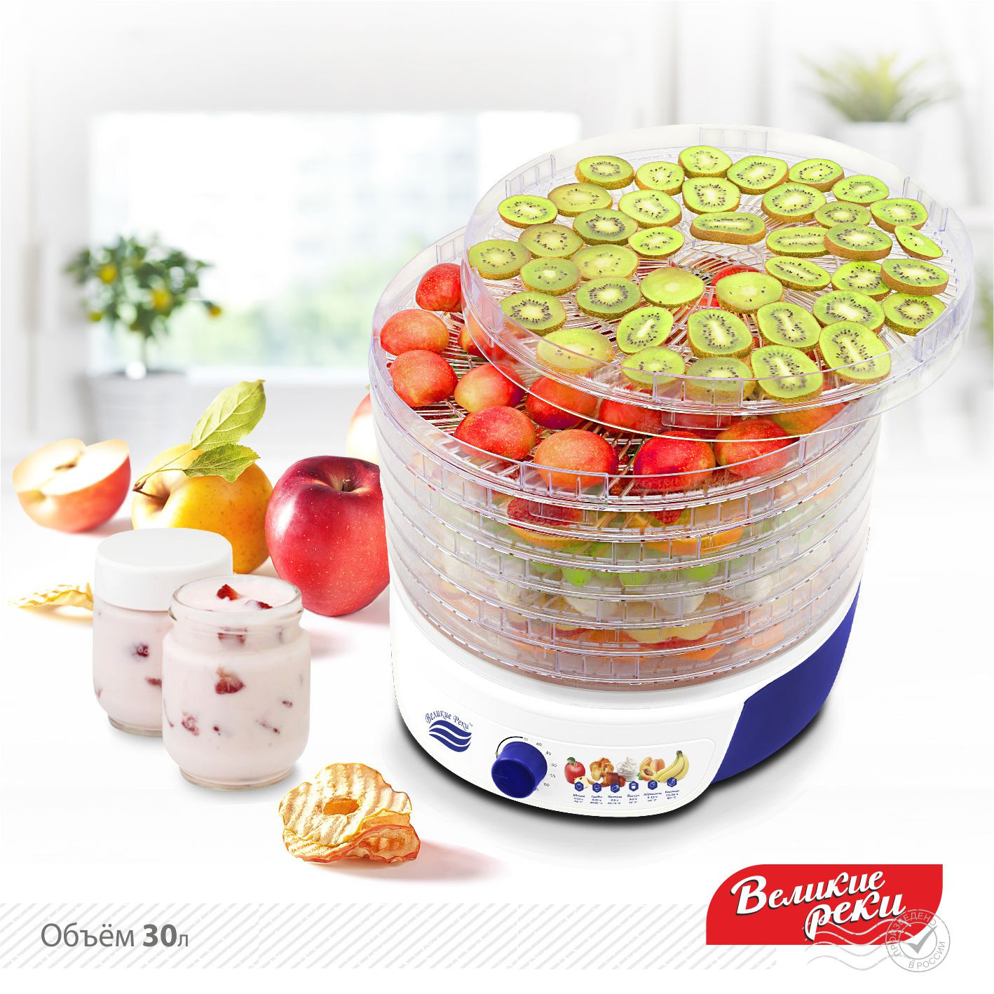 Особенности: Сушилка сделана из первичного пищевого пластика, не шумит. Терморегулятор. Позволяет сушить фрукты, овощи, грибы, травы. Функция приготовления йогурта. Ёмкости для йогурта в комплект не входят. Сушка овощей, фруктов, грибов сохраняет все витамины и полезные микроэлементы.