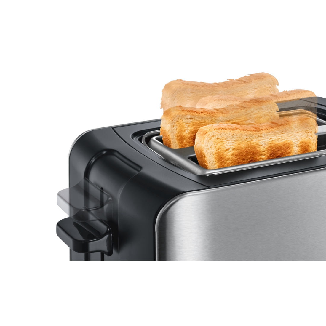 Особенности: Автоматическое центрирование тостов. Интегрированная складывающаяся подставка для подогрева выпечки. Высокий подъем решетки в слотах позволяет с легкостью извлекать небольшие ломтики хлеба. Дополнительная функция разморозки и подогрева. Компактный тостер для приготовления двух ломтиков хлеба.