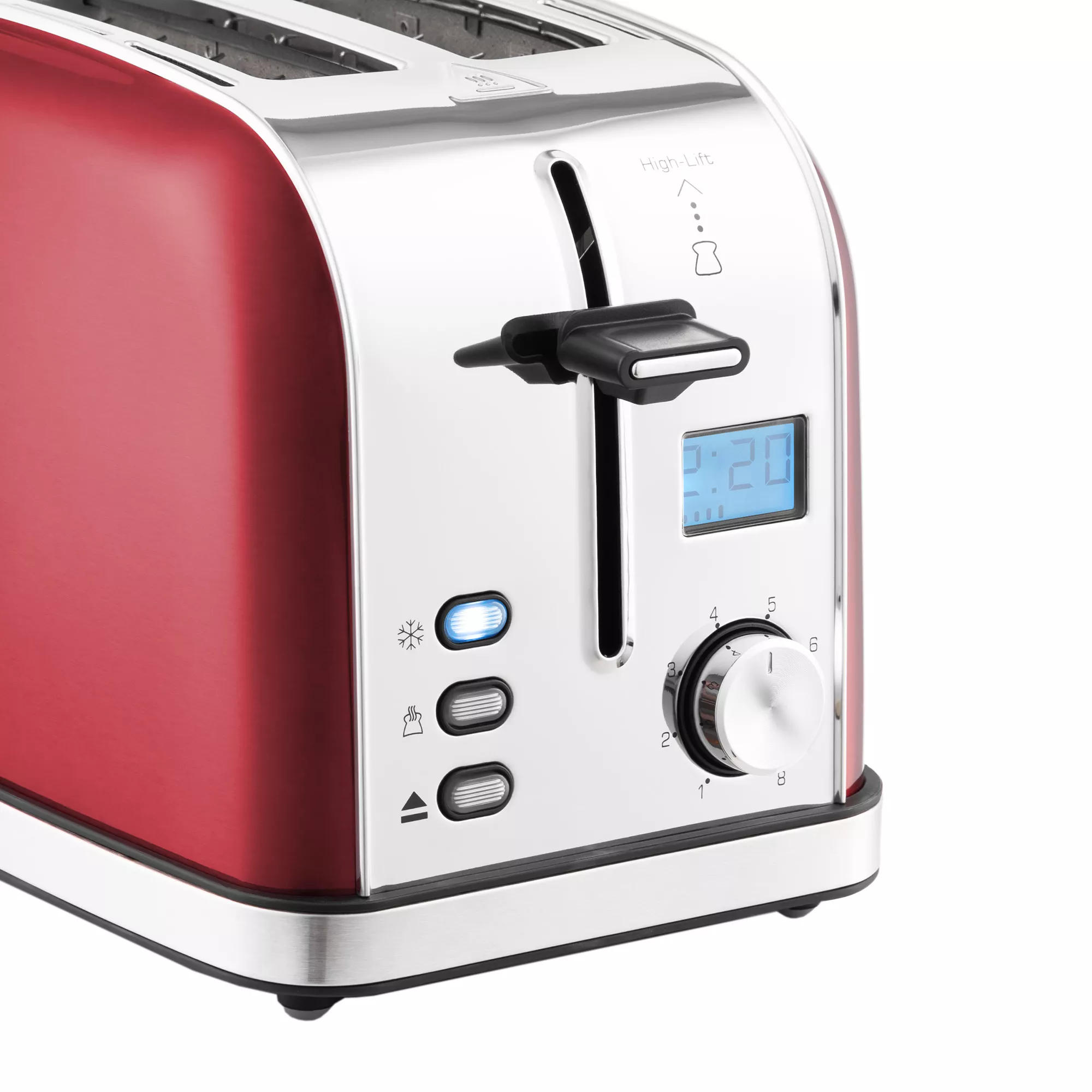 Оставшееся время показывается на жидкокристаллическом дисплее и позволяет рассчитать приготовление чашки кофе или чая, пока готовится тост. По окончании приготовления тостер автоматически отключается, а тосты поднимаются вверх для удобного извлечения.