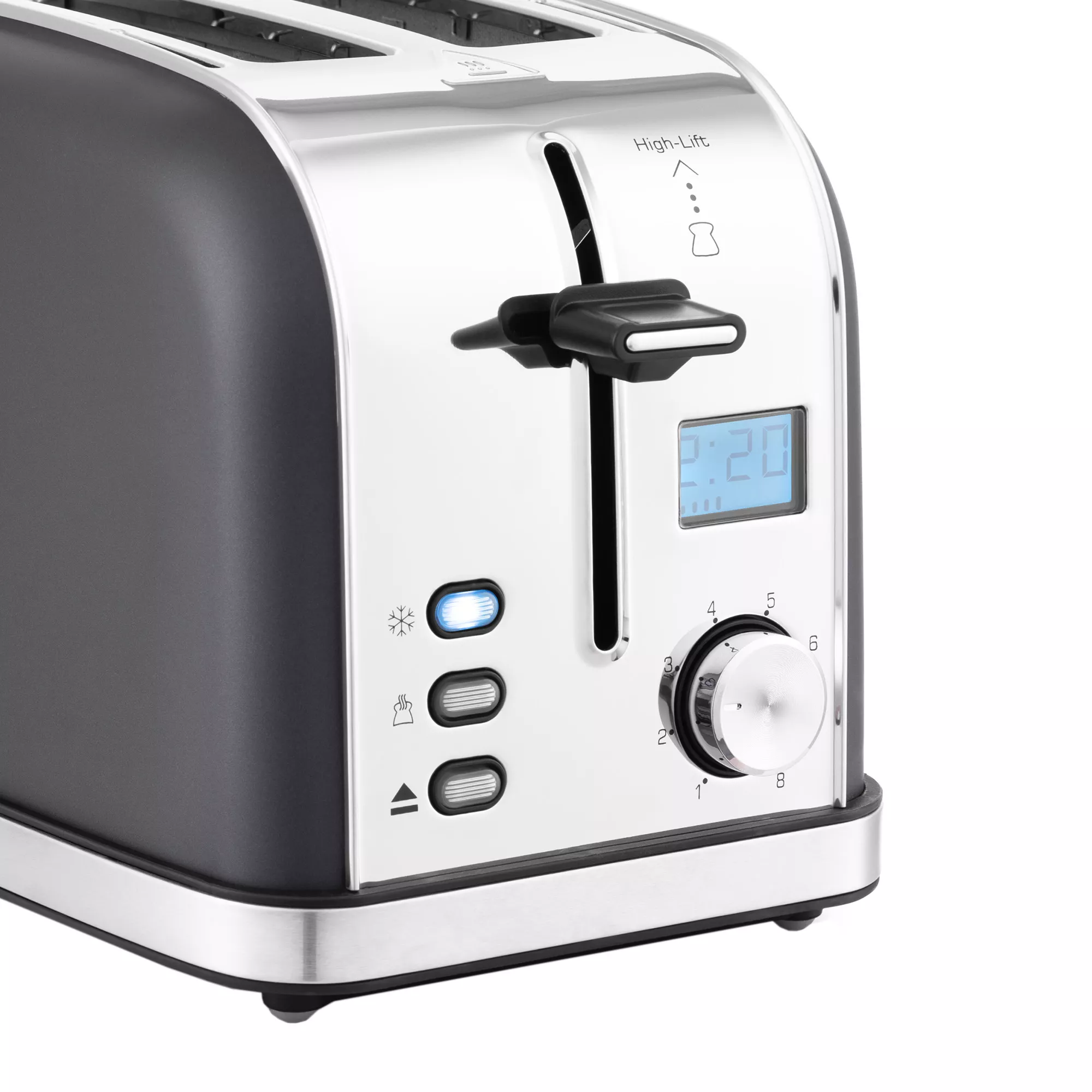 Оставшееся время показывается на жидкокристаллическом дисплее и позволяет рассчитать приготовление чашки кофе или чая, пока готовится тост. По окончании приготовления тостер автоматически отключается, а тосты поднимаются вверх для удобного извлечения.