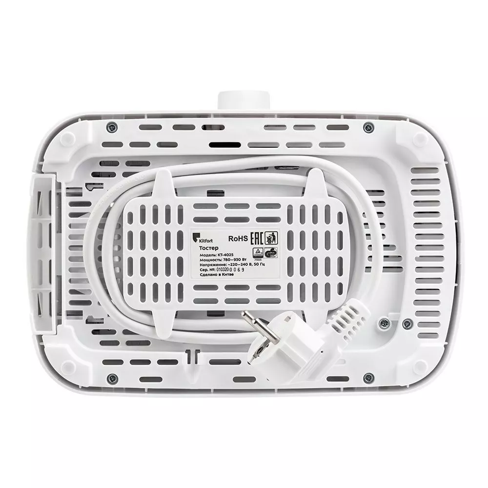 На дне корпуса тостера имеется отсек для хранения шнура, в который можно смотать излишки шнура электропитания, чтобы он не мешал на столе.