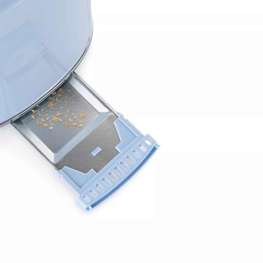 В нижней части корпуса тостера расположен съёмный поддон для сбора крошек. Просто выдвиньте его и выбросите скопившиеся крошки, а остатки протрите салфеткой.