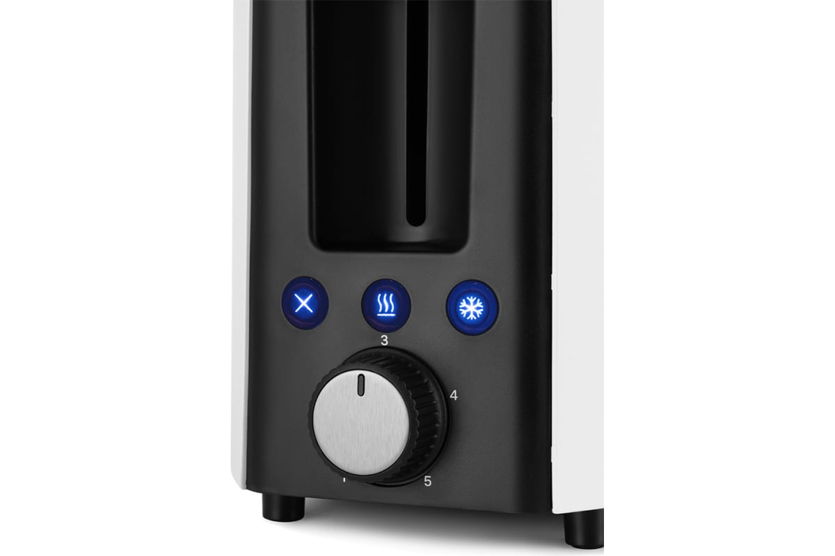 Тостер оснащен поворотным регулятором степени обжаривания и тремя кнопками со световыми индикаторами. Режим подогрева служит для подогрева уже готовых тостов, если они остыли, или подогрева холодного хлеба без обжаривания. Режим разморозки позволяет приготовить тосты из замороженного хлеба.