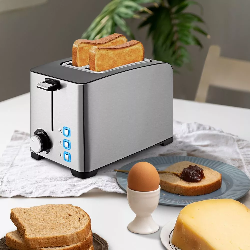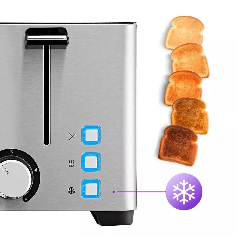 Тостер имеет 5 степеней обжарки, которые можно настраивать регулятором. Кнопка «подогрев» поможет разогреть тост до необходимого состояния. Благодаря кнопке «разморозка» можно легко подогреть замороженные кусочки хлеба без потери его вкусовых качеств.