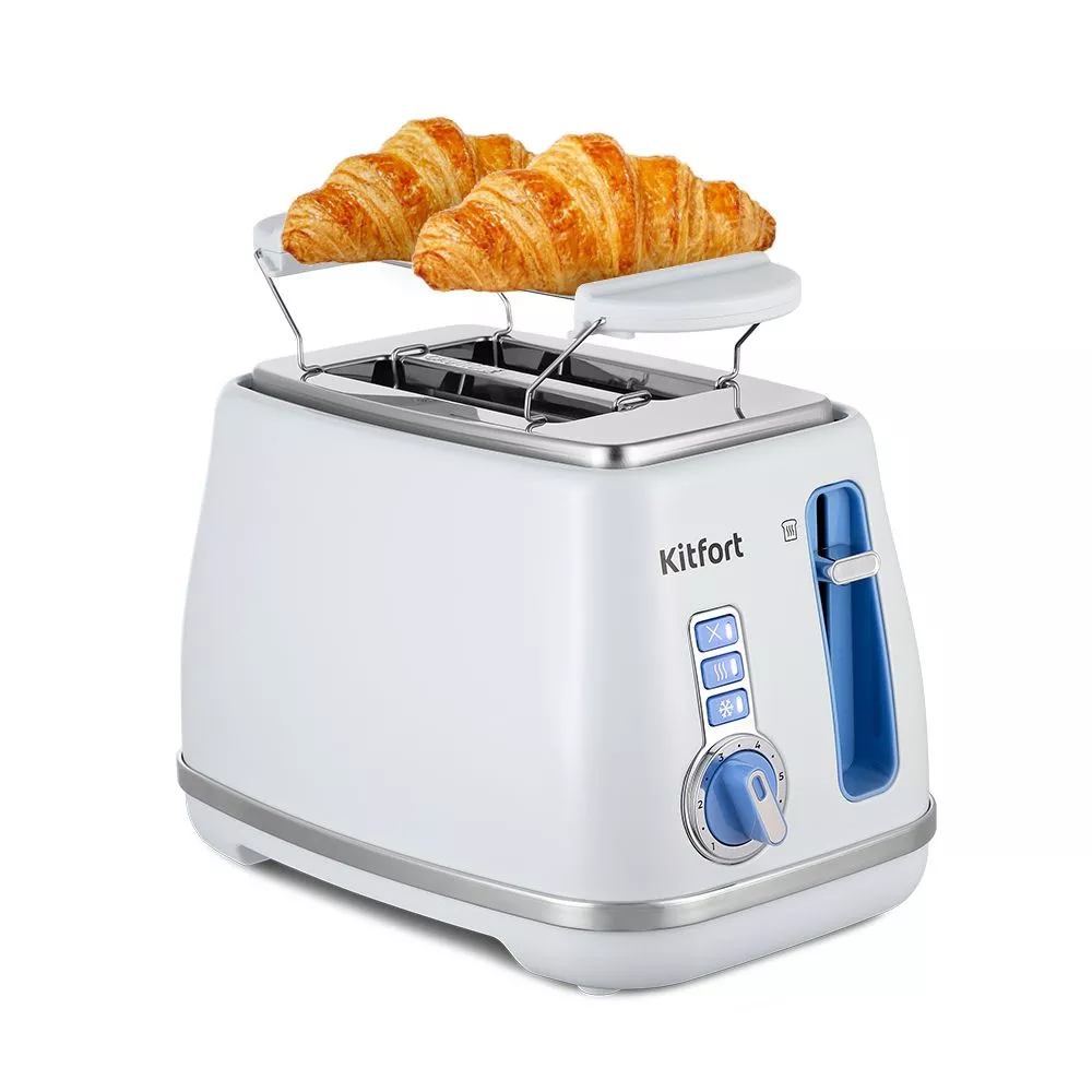 Тостер имеет специальную подставку для подогрева булочек, круассанов и других хлебобулочных изделий. Она съёмная и легко устанавливается на тостер.