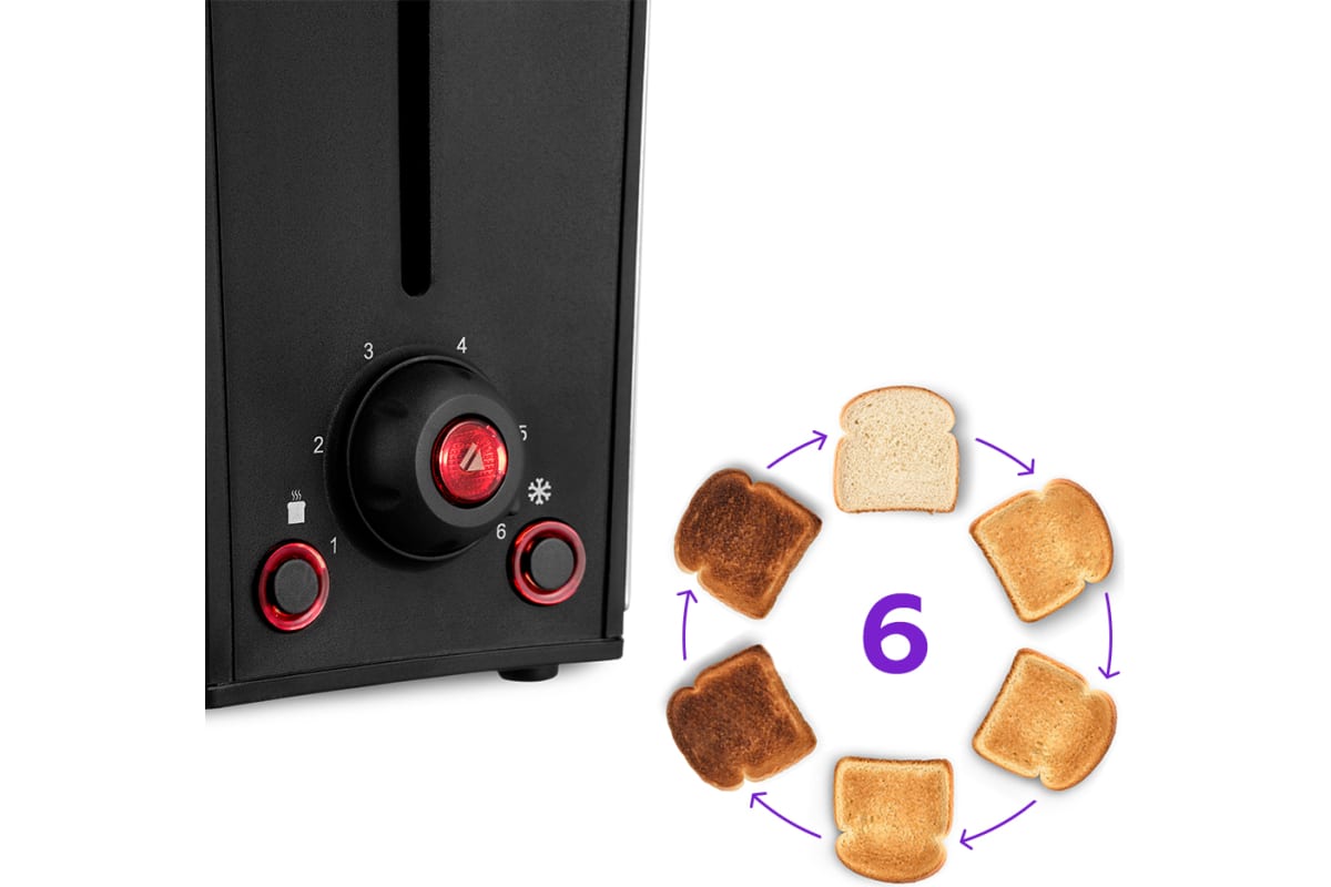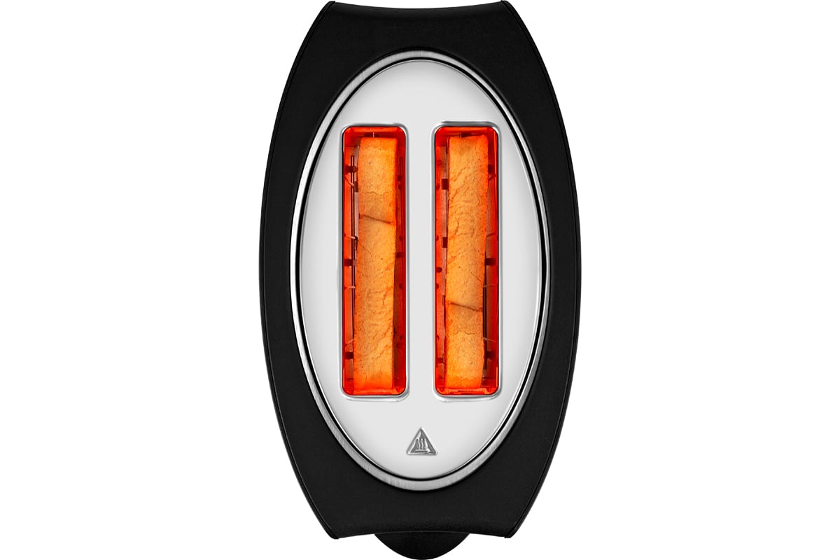 Тостер оснащен регулятором степени обжаривания и тремя кнопками со световыми индикаторами. Режим подогрева служит для подогрева уже готовых тостов, если они остыли. Режим разморозки позволяет приготовить тосты из замороженного хлеба. Загруженные тосты автоматически центрируются, чтобы их обжаривание с двух сторон было равномерной независимо от толщины куска. По окончании приготовления тостер автоматически отключается, а тосты поднимаются вверх, чтобы их было удобнее извлечь. Механизм экстра-подъема позволяет приподнять выше тосты небольшого размера для их удобного извлечения. Вы можете приготовить 1 или 2 тоста одновременно.