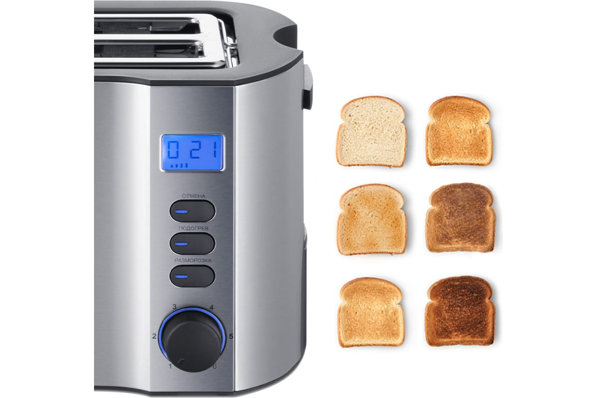 Тостер оснащен регулятором степени обжаривания и тремя кнопками со световыми индикаторами. Режим подогрева служит для подогрева уже готовых тостов, если они остыли. Режим разморозки позволяет приготовить тосты из замороженного хлеба. Загруженные тосты автоматически центрируются, чтобы их обжаривание с двух сторон было равномерным независимо от толщины куска. По окончании приготовления тостер автоматически отключается, а тосты поднимаются вверх, чтобы их было удобнее извлечь. Вы можете приготовить 1 или 2 тоста одновременно.