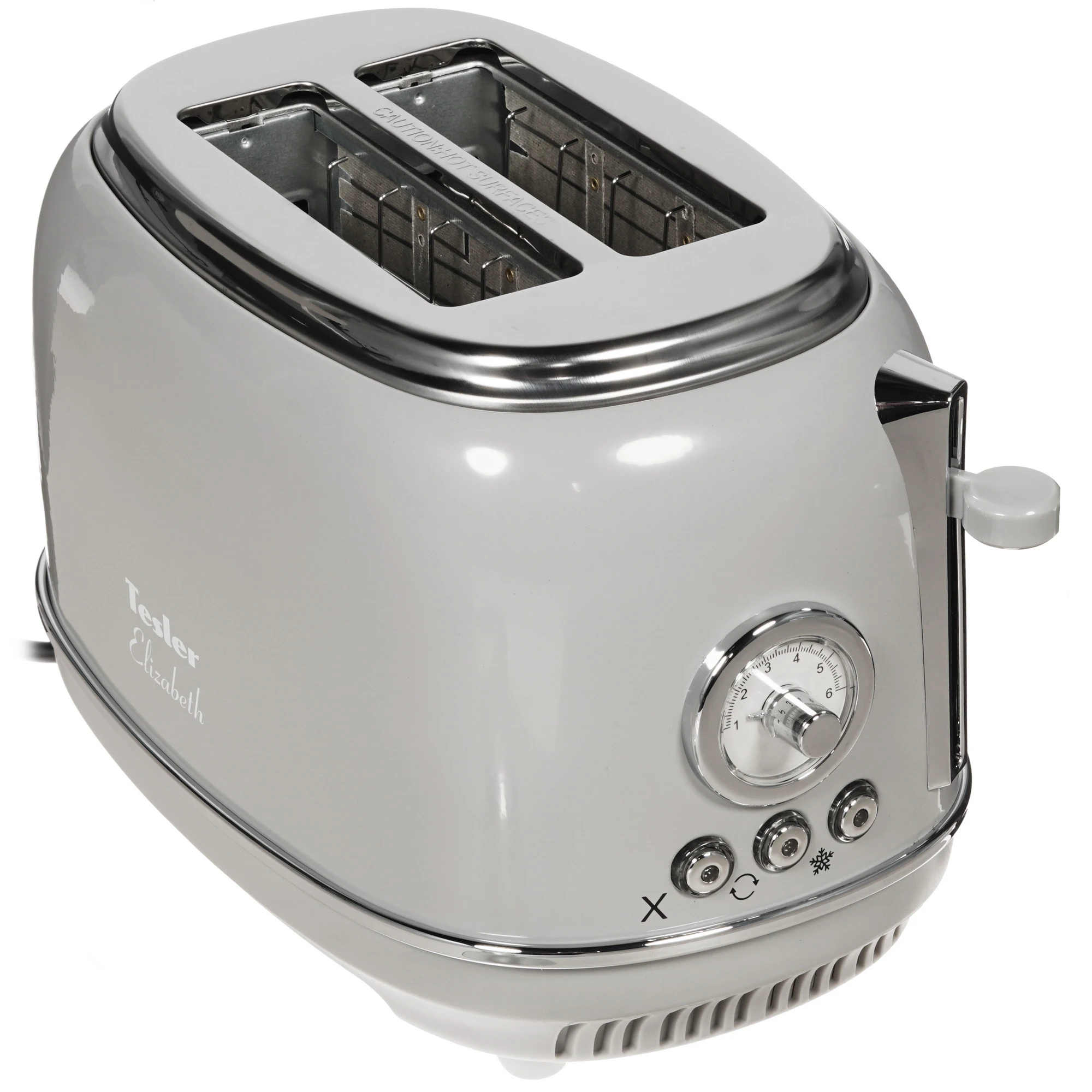 Тостер TESLER TT-245 выполнен в металлическом корпусе серого цвета. В нижней части имеется выдвижной съемный поддон, который облегчает очистку от крошек. Из других особенностей отмечаются отсек для удобного размещения кабеля, прорезиненные ножки и технология защиты от перегрева.