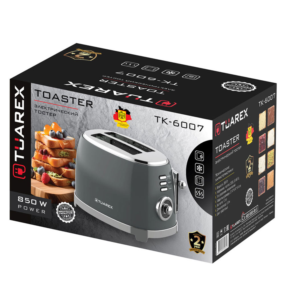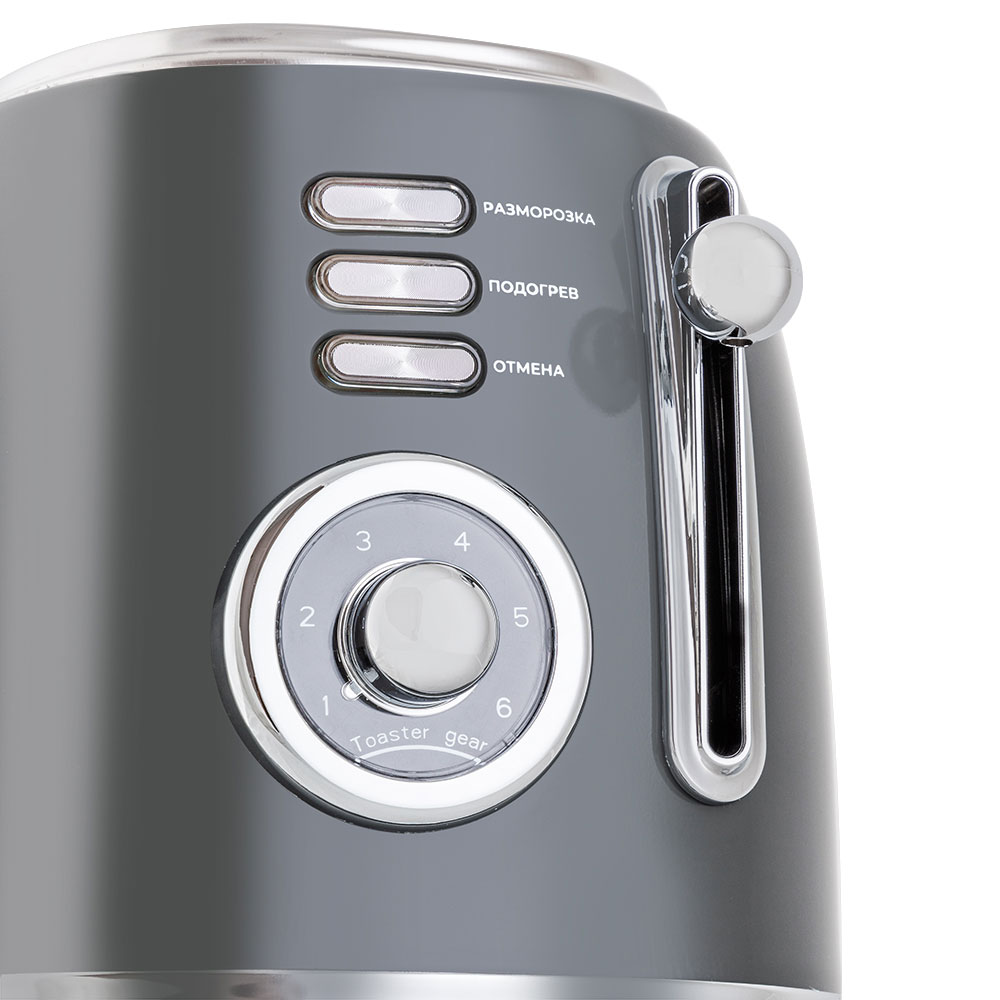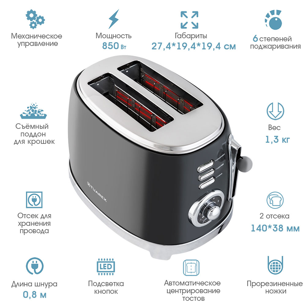 Тип управления: механический, 6 степеней поджаривания, Функция автоматического центрирования тостов, Термоизолированный корпус, Функции разморозки, Функция подогрева, Функция отмены, Отсек для хранения провода питания, Съемный поддон для крошек, Прорезиненные ножки, Автоматический выброс тостов, LED подсветка кнопок