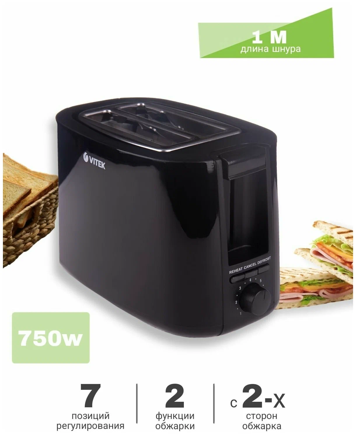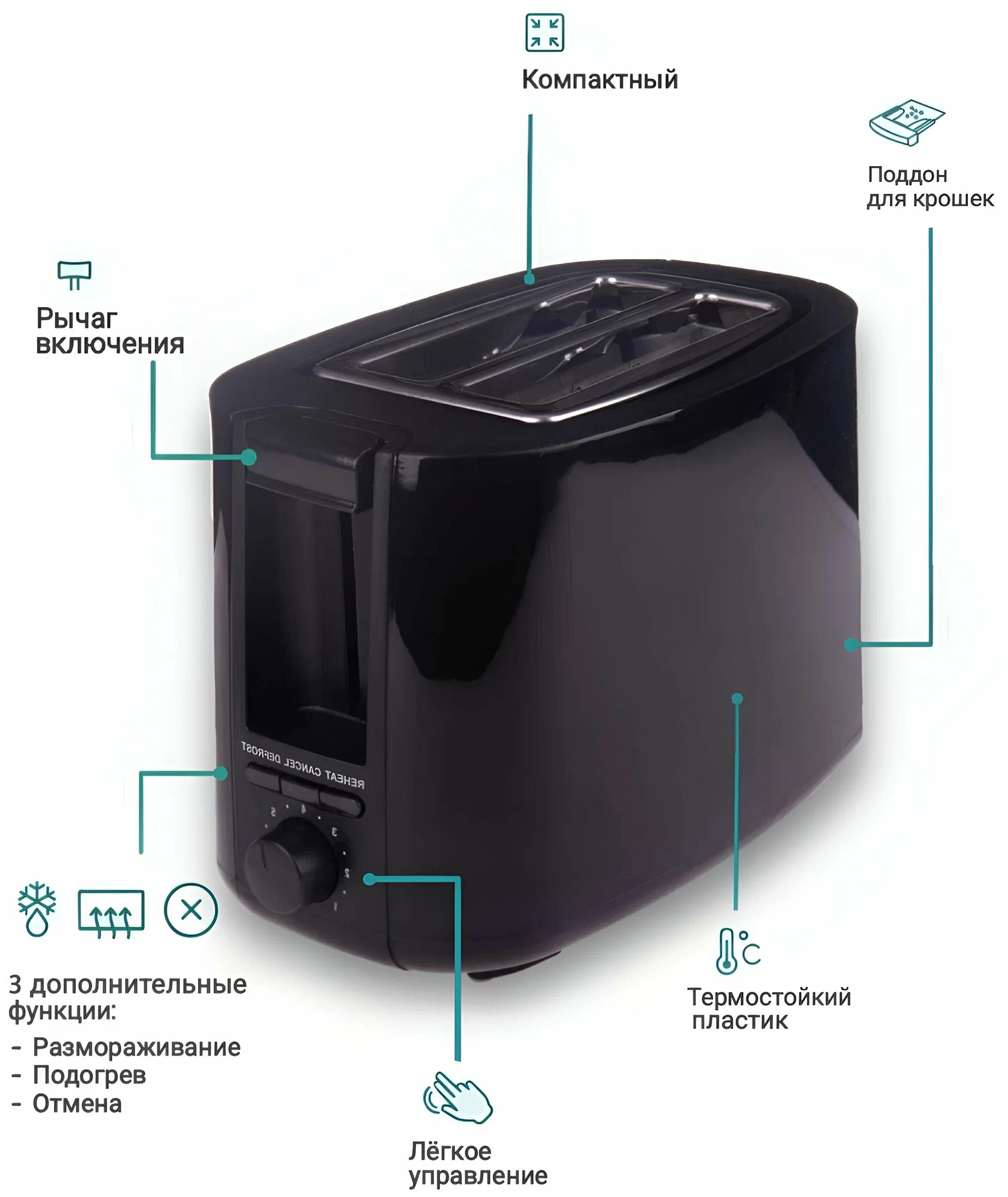 автоматическое поднятие тостов, кнопка отмены, плавная регулировка температуры, регулировка степени обжаривания