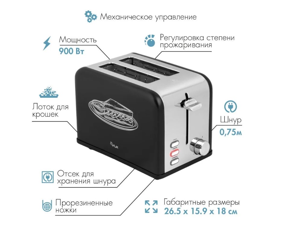 Благородный черный цвет в сочетании со стальной вставкой на корпусе заставят обратить внимание на себя Ваших гостей. Два больших отсека для тостов позволят одновременно готовить для нескольких Ваших гостей, функция автоматического центрирования тостов поможет равномерно поджарить с обеих сторон тосты. С помощью прорезиненных ножек тостер VLK Palermo 101будет устойчив на любой поверхности. При хранении тостера и экономии места предусмотрен отсек для хранения сетевого шнура. Съемный лоток для крошек упростит очистку тостера.