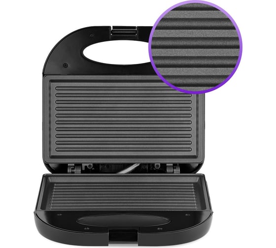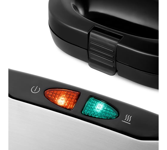 Индикатор питания горит, когда прибор включён в сеть, а индикатор нагрева горит, пока панели разогреваются. Зажим на ручке удерживает крышку бутербродницы в закрытом состоянии, что делает готовку, транспортировку и хранение более удобными.