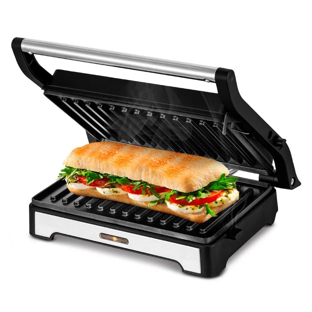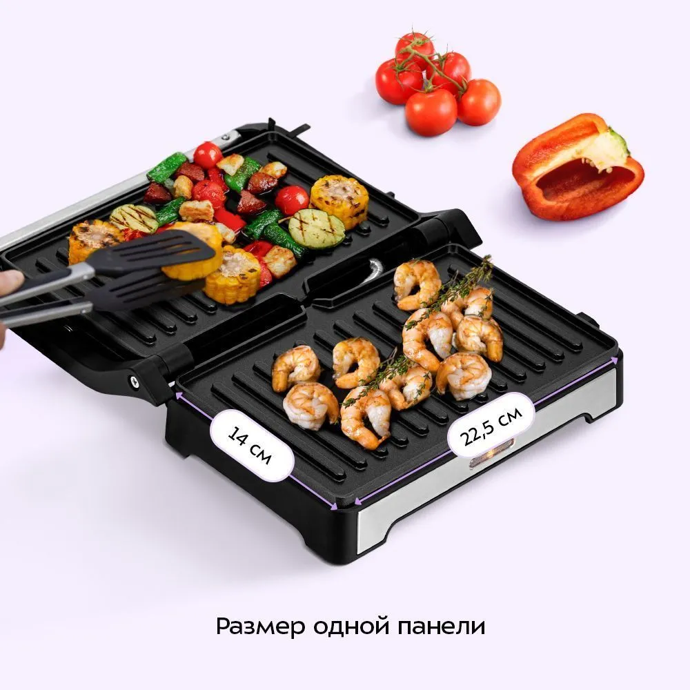 Конструкция бутербродницы позволяет готовить в двух режимах: двустороннем и одностороннем. В двустороннем режиме крышка откидывается на 180°, благодаря чему продукты можно выложить сразу на обе панели. Также есть поддоном для слива жира и сока.