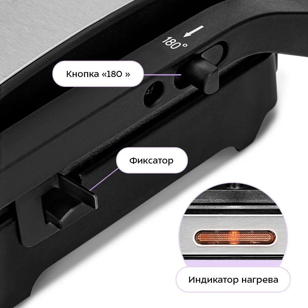 Индикатор горит, пока панели разогреваются. Когда панели достигают нужной температуры, индикатор гаснет. Специальный фиксатор сбоку бутербродницы удерживает крышку в закрытом состоянии, что делает готовку, транспортировку и хранение более удобными.