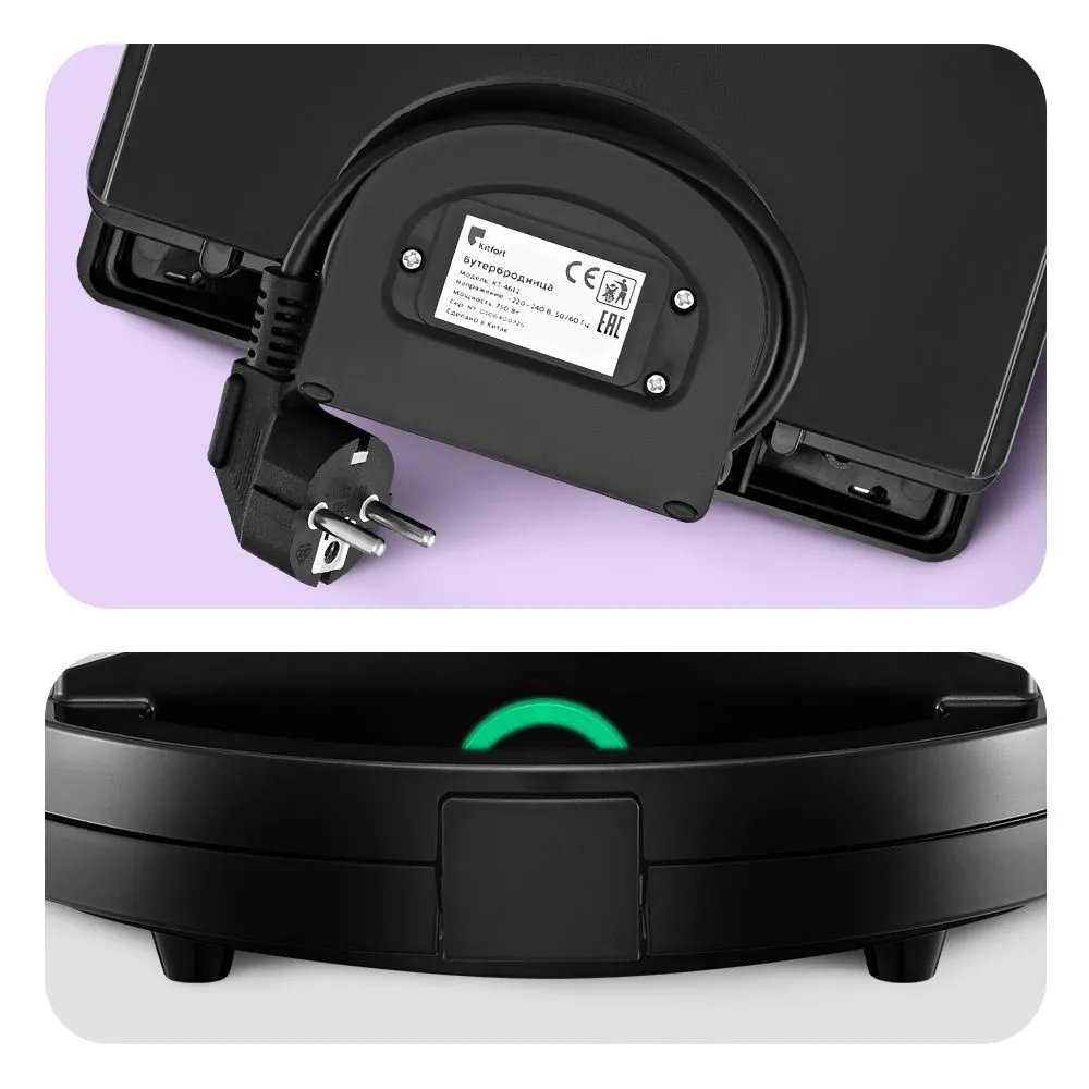 На дне прибора есть отсек для хранения шнура питания, что обеспечивает удобное хранение устройства. Фиксатор на ручке удерживает крышку бутербродницы в закрытом состоянии, что делает готовку, транспортировку и хранение более удобными.