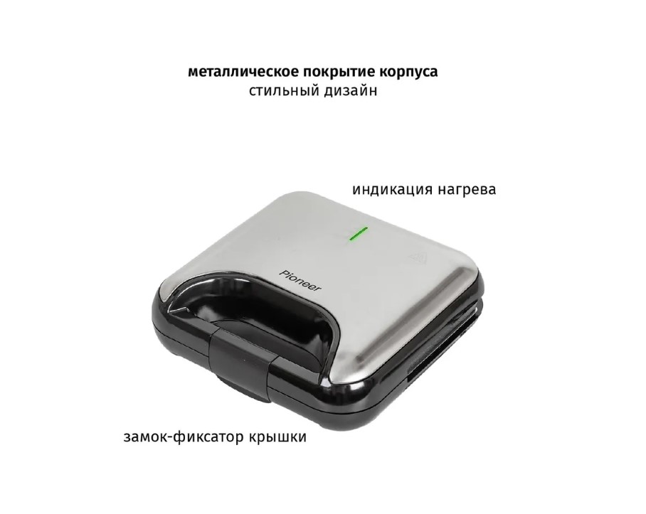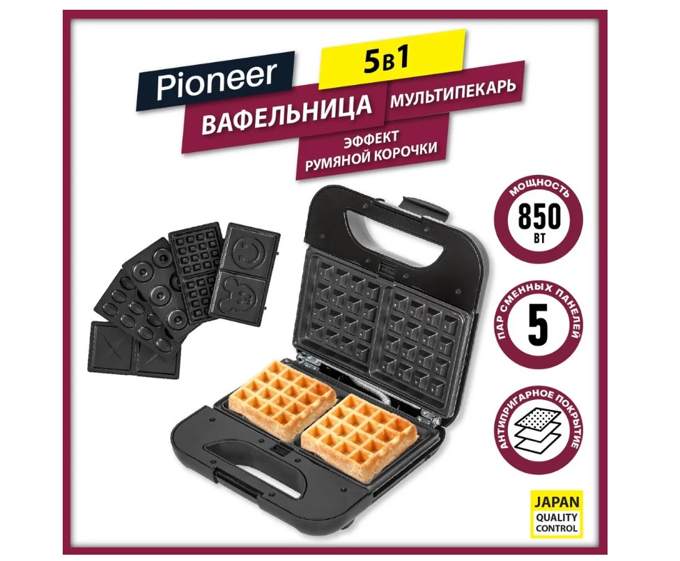 Для сторонников здорового образа жизни и полезного питания бренд Pioneer представляет свою новинку – стильный мультипекарь Pioneer 5 в 1 мощностью 850 Вт с комплектом из 5 пар сменных панелей с антипригарным покрытием, фиксатором крышки и индикацией работы. Мультипекарь SM315D 5 в 1 от Pioneer - это качественное многофункциональное устройство, заменяющее вафельницу, сэндвичницу и орешницу. Достаточно менять панели и получать удовольствие от вкуса нежных венских вафель на завтрак, сэндвичей с румяной корочкой или самого вкусного, ароматного печенья – «орешков» с вареной сгущенкой. Также вы сможете приготовить вкуснейшие пончики-кексы и печенье «улыбка».