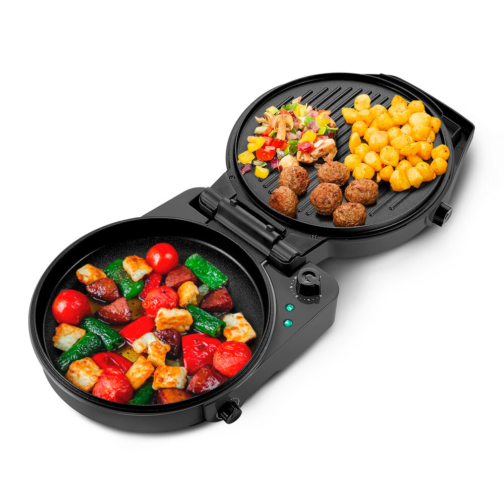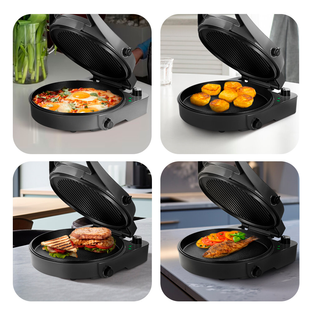 Прорезиненные ножки не дают прибору скользить по столу во время готовки. Диаметр панелей 30 см и мощность 1800 Вт.