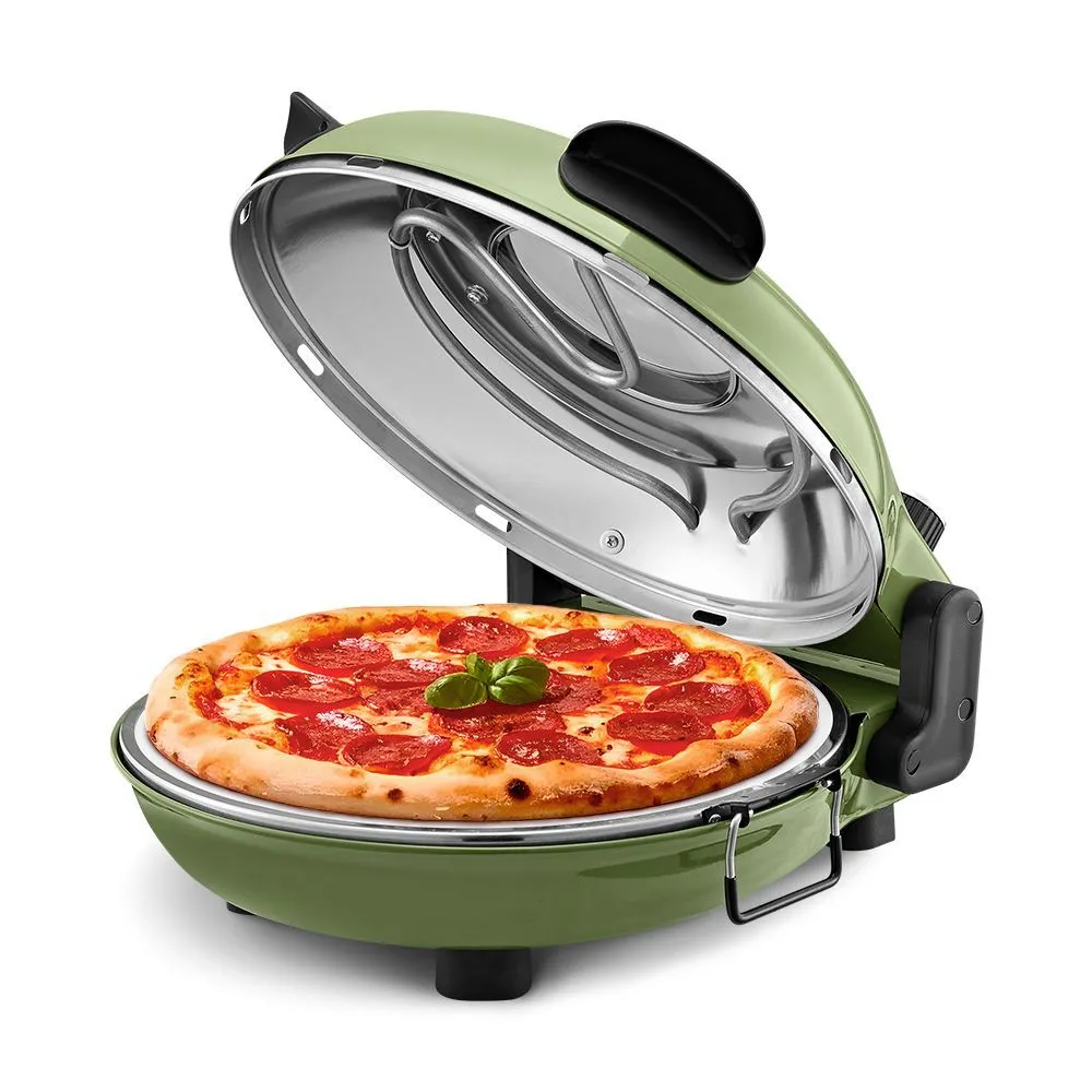 Пиццамейкер оснащён регулятором температуры и таймером, индикаторами питания и нагрева. Нагревательные элементы расположены в корпусе и крышке прибора. Всего у пиццамейкера 5 уровней нагрева и таймер до 15 минут.