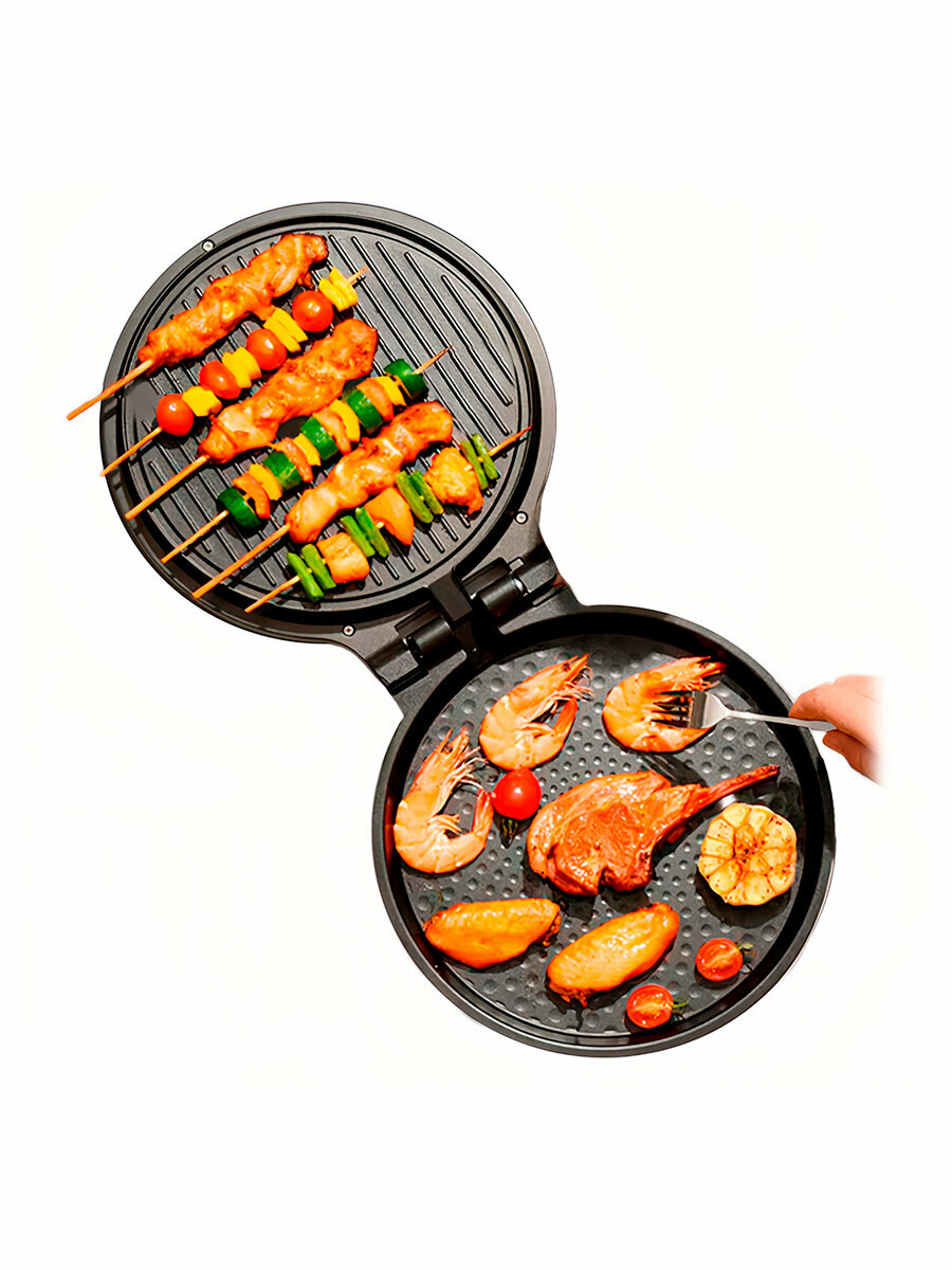 Рабочая поверхность выполнена из безопасного антипригарного покрытия. Можно готовить два разных блюда на верхней и нижней панели одновременно. Также сковороду можно использовать в закрытом виде, получая равномерное запекание, благодаря двустороннему нагреву и использовать функцию гриль. Рабочие области легко очищаются, достаточно просто протереть их губкой, конструкция верхней рабочей области оснащена желобом для стока масла в нижний поддон. В комплекте идет переходник для розеток.