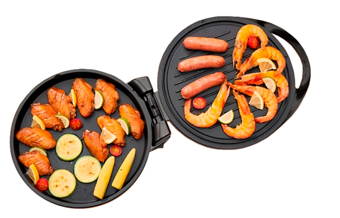 Рабочая поверхность выполнена из безопасного антипригарного покрытия, диаметр поверхности около 29 см, а глубина нижней чаши 2.5 см. Можно готовить два разных блюда на верхней и нижней панели одновременно. Также сковороду можно использовать в закрытом виде, получая равномерное запекание, благодаря двустороннему нагреву и использовать функцию гриль. Рабочие области легко очищаются, достаточно просто протереть их губкой. В комплекте идет переходник для розеток.