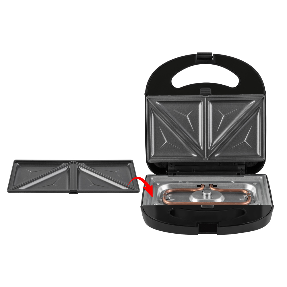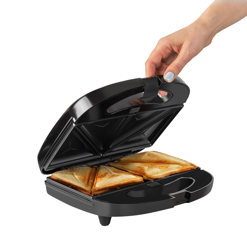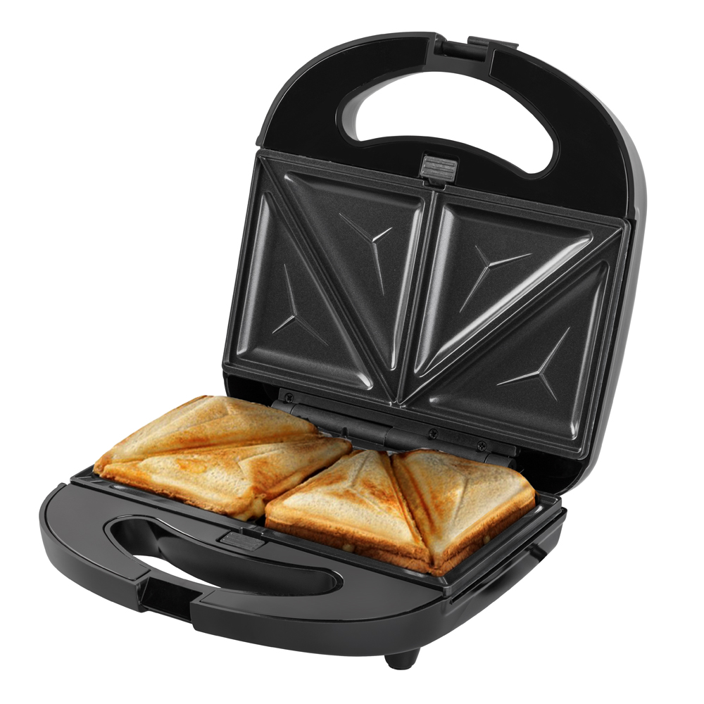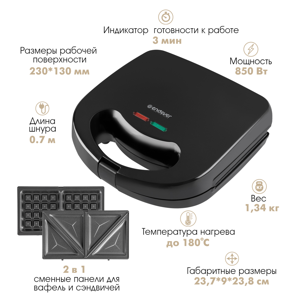 2 в 1: сменные панели для вафель и сэндвичей, Одновременное приготовление 2 вафель или 4 сэндвичей, Корпус их термостойкого биопластика, Антипригарное покрытие, Индикатор включения, Индикатор готовности к работе, Эргономичная не нагревающаяся ручка, Автофиксация для облегчения закрывания, Защита от перегрева, Вертикальное хранение