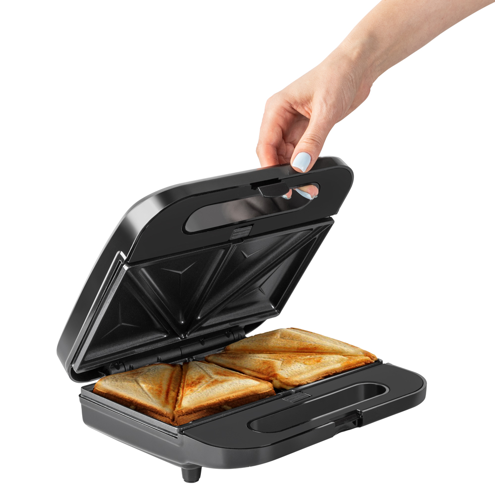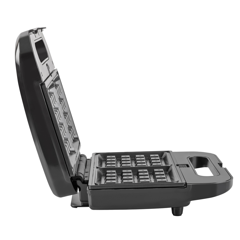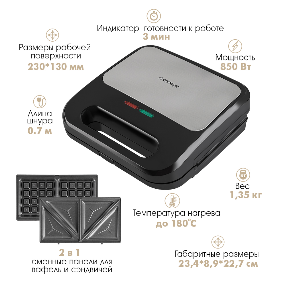 2 в 1: сменные панели для вафель и сэндвичей, Одновременное приготовление 2 вафель или 4 сэндвичей, Корпус их термостойкого биопластика, Антипригарное покрытие, Индикатор включения, Индикатор готовности к работе, Эргономичная не нагревающаяся ручка, Автофиксация для облегчения закрывания, Защита от перегрева, Вертикальное хранение