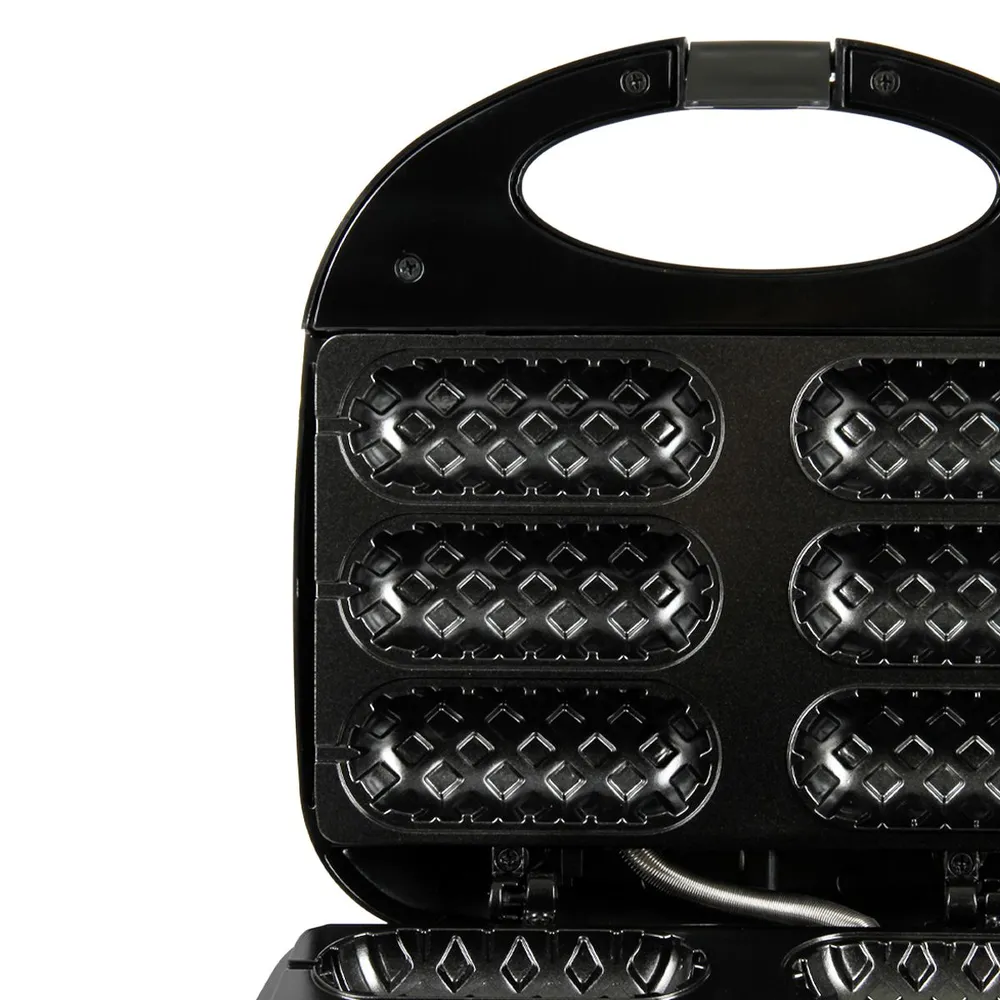 Вафельница для сосисок и для корн догов имеет шесть овальных форм, размером 9 см х 3,5 см. Каждая форма для выпечки имеет оригинальный вафельный рисунок. Верхняя и нижняя рабочая панель вафельницы - сосисочницы имеет антипригарное покрытие, но для комфортного приготовления рекомендуем вам слегка смазывать формы растительным маслом. По бокам слева и справа каждая форма имеет выемку для деревянной палочки, для удобного приготовления хот дога. Несмотря на то, что это аппарат для хот догов, его можно использовать в разных кулинарных задумках. Попробуйте, вам точно понравится!