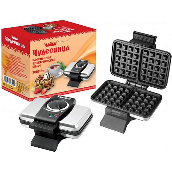 Вафельница электрическая Чудесница ЭВ-3Ч. Мощность 1000Вт, две формы для приготовления бельгийских вафель, нержавеющий корпус, тефлоновое покрытие жаропрочной поверхности, автоматическое поддержание заданной температуры нагрева, индикатор питания.