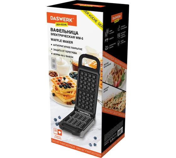 Электровафельница для венских бельгийских вафель DASWERK антипригарная, 2 вафли, 700 Вт Wm-5, 455652