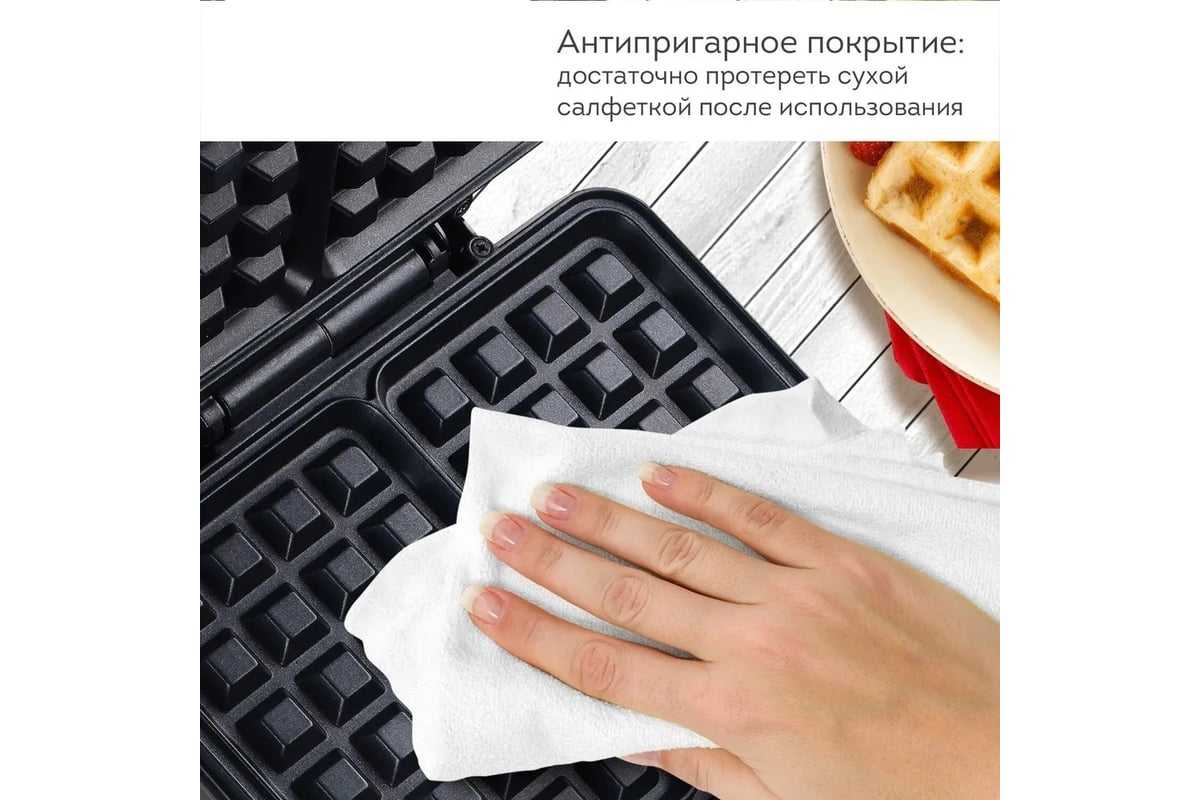 Антипригарное покрытие и встроенный нагревательный элемент мощностью 1200 Вт обеспечивают равномерный нагрев вафельницы. С её помощью можно за один раз легко приготовить 2 вафли.