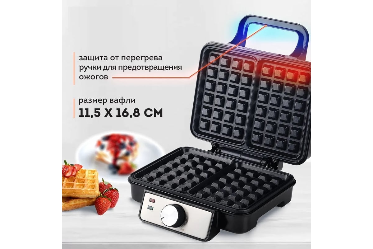 Вафельница оснащена защитой от перегрева, что обеспечивает безопасность при ее эксплуатации. Система термостата и индикатор нагрева регулируют температуру автоматически – достаточно просто подключить прибор, дождаться оптимального нагрева и залить тесто.