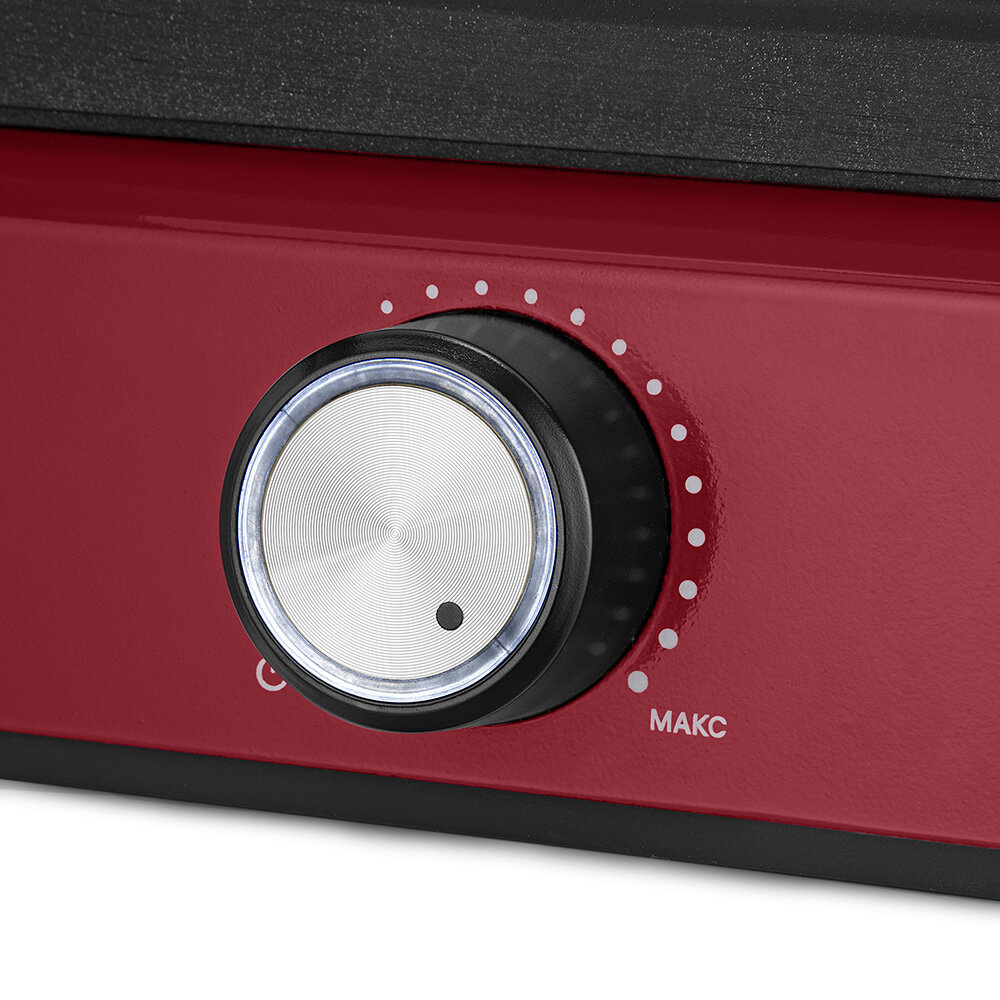 Регулятор является ручкой термостата. Термостат обеспечивает возможность плавно регулировать температуру и поддерживать ее в процессе приготовления. На регуляторе находится индикатор питания и нагрева.