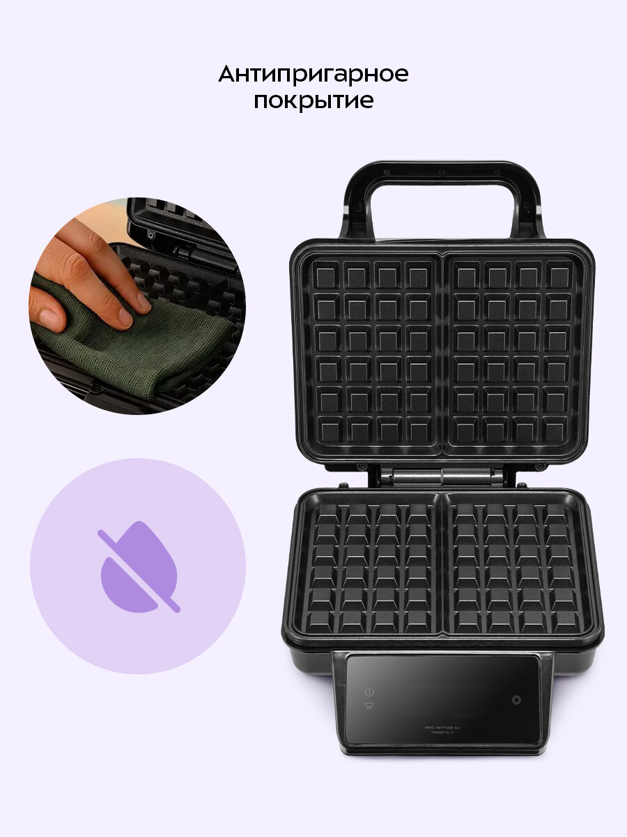 Благодаря антипригарному покрытию тесто не прилипает к панелям, что упрощает процесс приготовления и позволяет делать идеальные вафли без лишних усилий. Также антипригарное покрытие позволяет готовить без масла и облегчает чистку панелей.
