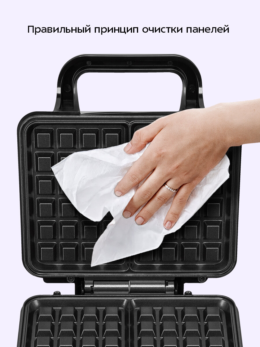 Очищайте панели бумажными полотенцами, удаляя остатки теста. Затем протрите мягкой влажной тканью. При сильных загрязнениях используйте немного мягкого моющего средства. Избегайте абразивных средств, чтобы не повредить антипригарное покрытие.