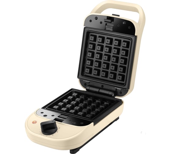Вафельница оснащена термостатом для поддержания температуры панелей, а также индикатором работы. Корпус выполнен из пластика. Крышка вафельницы фиксируется в закрытом состоянии, что делает готовку, транспортировку и хранение более удобными.