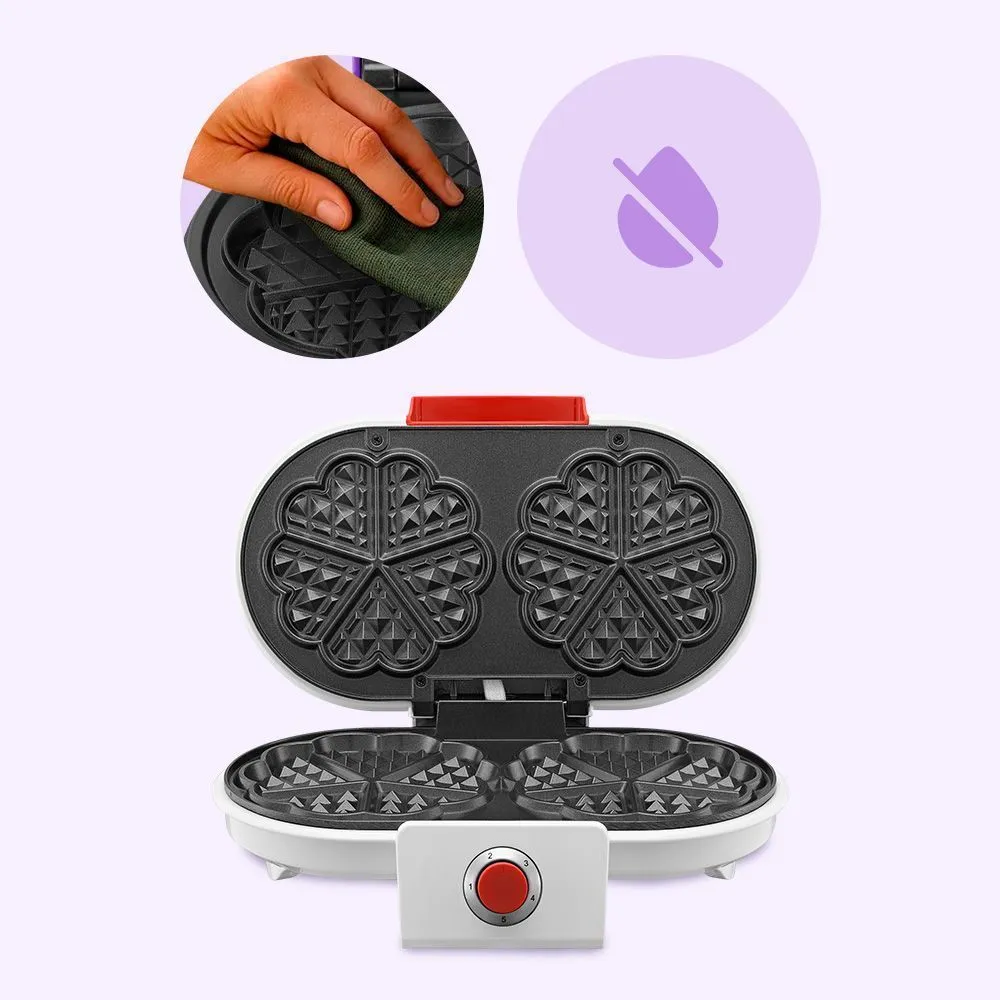 Вафельница предлагает множество форматов для любителей десертов. Вы можете приготовить две большие вафли в форме цветка, чтобы насладиться их эффектным внешним видом. Или 10 маленьких вафель в виде сердечек, которые займут меньше времени приготовления.