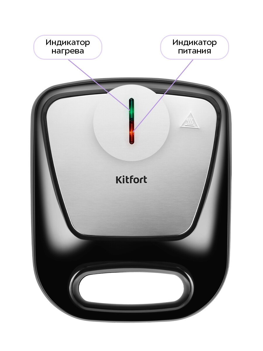 КТ-4688 оснащена индикаторами питания и нагрева. Индикатор питания горит при включении в сеть, индикатор нагрева — при разогреве и гаснет при достижении нужной температуры. В процессе работы нагрев включается периодически. Открывайте вафельницу за ручку.