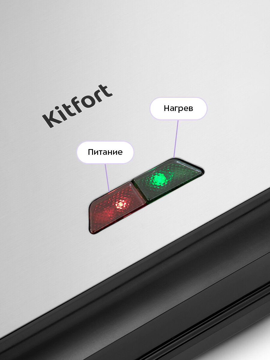 Вафельница оснащена термостатом для поддержания температуры панелей, а также индикаторами питания и нагрева. Индикатор питания горит, когда прибор включен в сеть. Индикатор нагрева горит, пока панели нагреваются до нужной температуры.