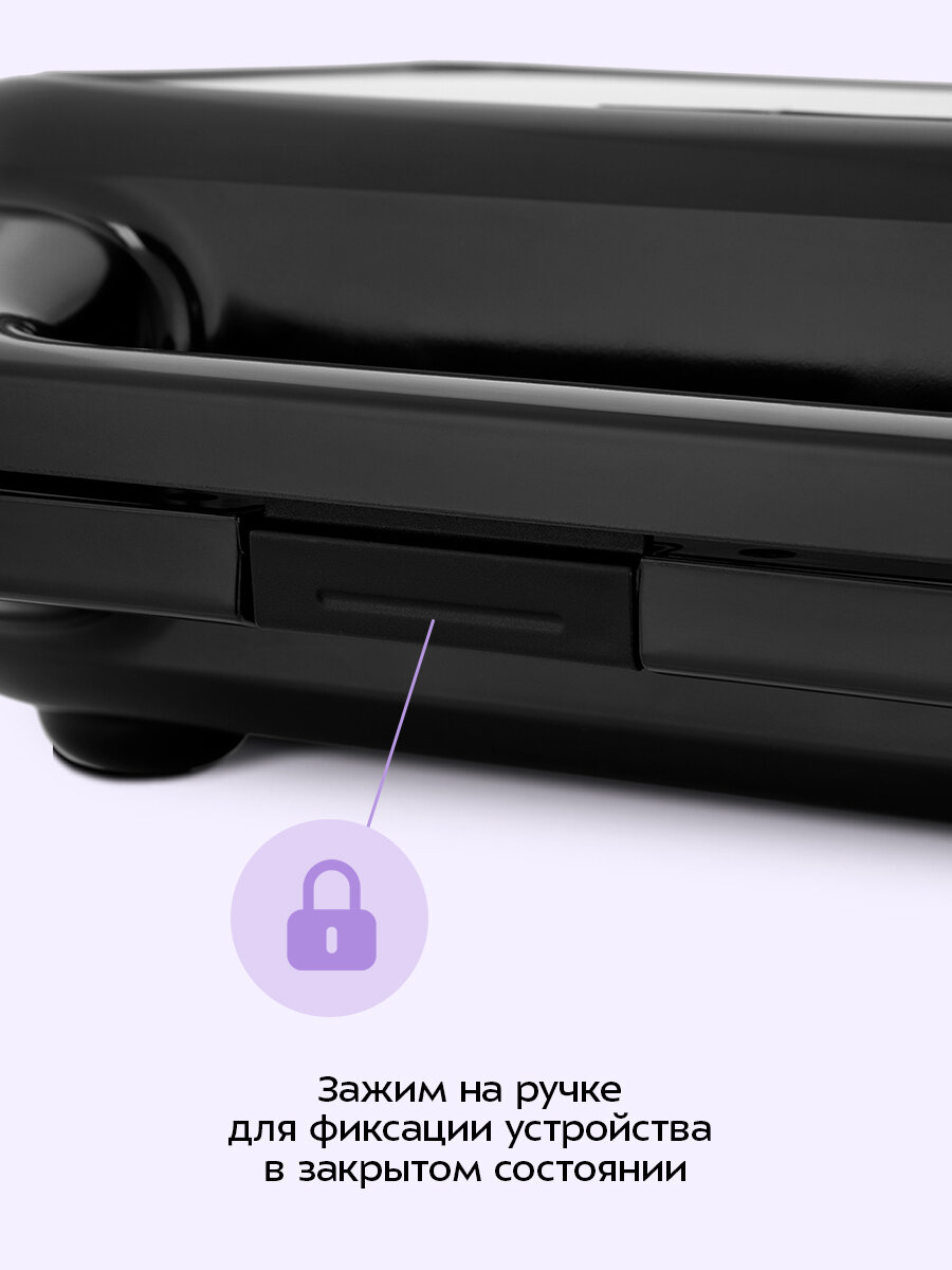 Конструкция вафельницы предусматривает приготовление продуктов с закрытой крышкой. При таком приготовлении продукты находятся между двух нагреваемых панелей и готовятся сразу с двух сторон. Зажим на ручке удерживает крышку вафельницы в закрытом состоянии.
