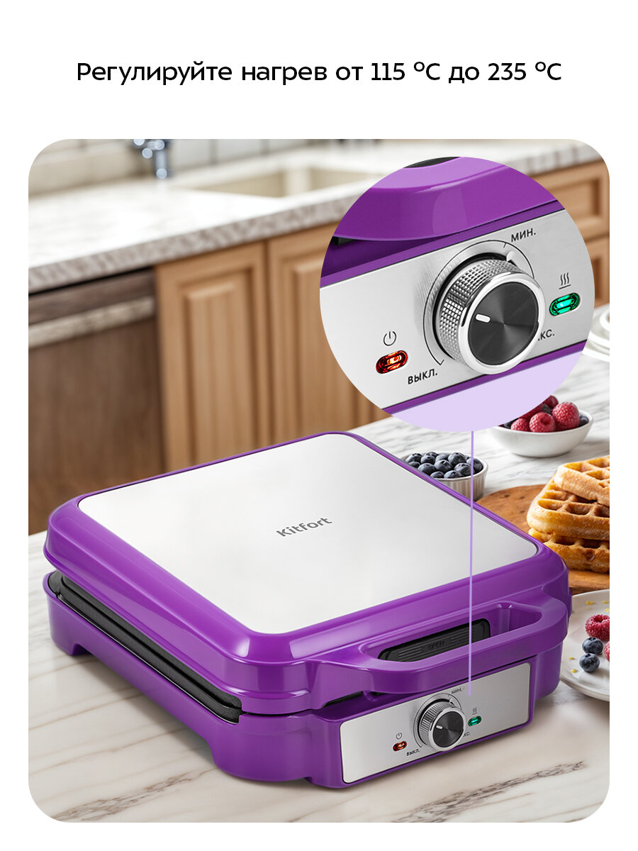 Вафельница КТ-5604 отлично подойдёт для большой семьи: за раз она готовит 4 бельгийские вафли или 8 треугольных бутерброда. Готовьте завтрак на всю семью за раз! Никаких очередей — все едят горячим и вместе.