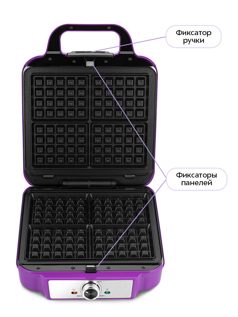 Чтобы снять панели, достаточно потянуть за фиксатор. Зажим на ручке удерживает крышку вафельницы в закрытом состоянии, что делает готовку, транспортировку и хранение более удобными.